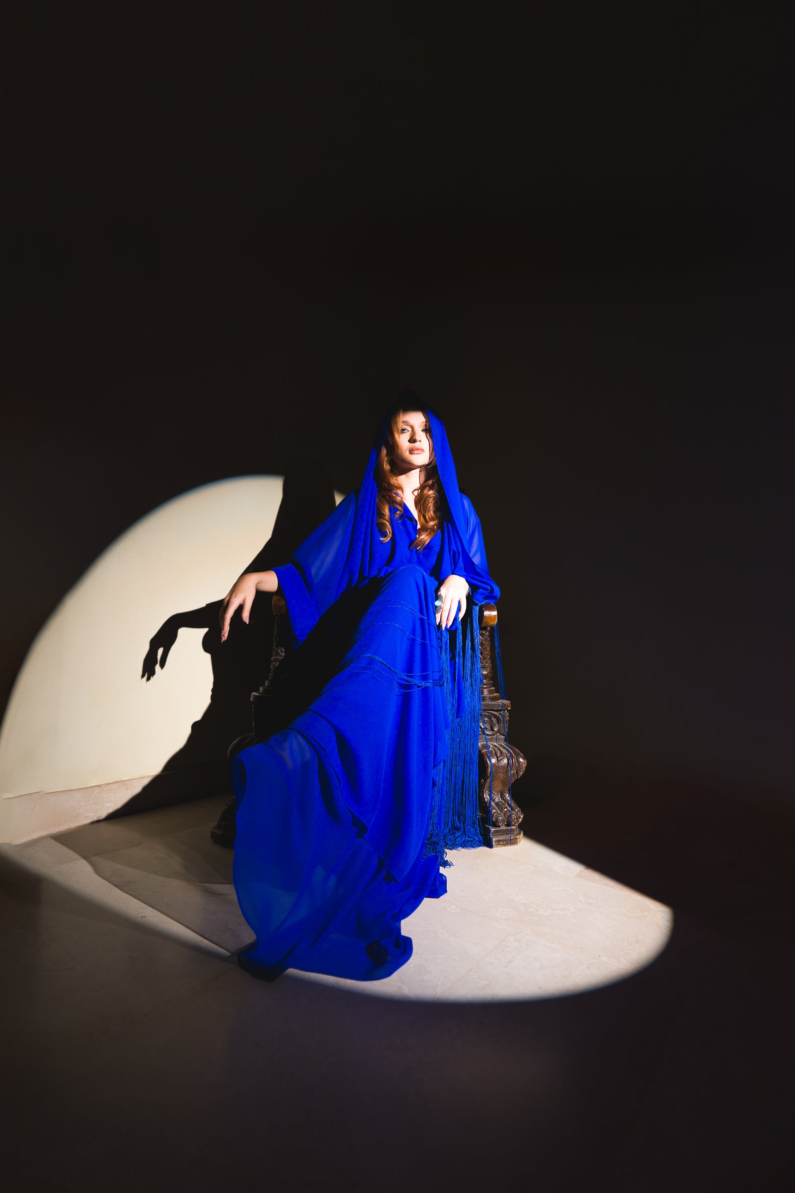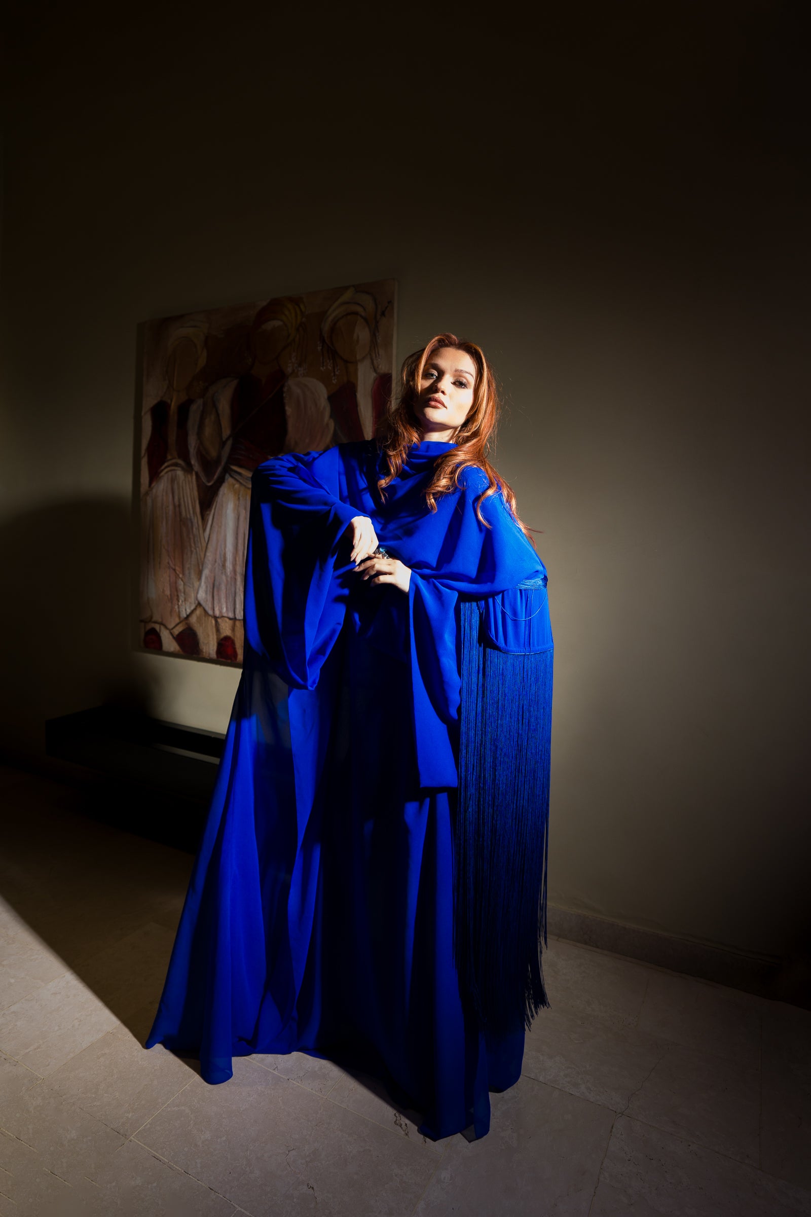 A flowing crepe georgette silhouette with wide, fluid sleeves, finished with fringe detailing that brings depth, movement, and a bold contemporary edge.
