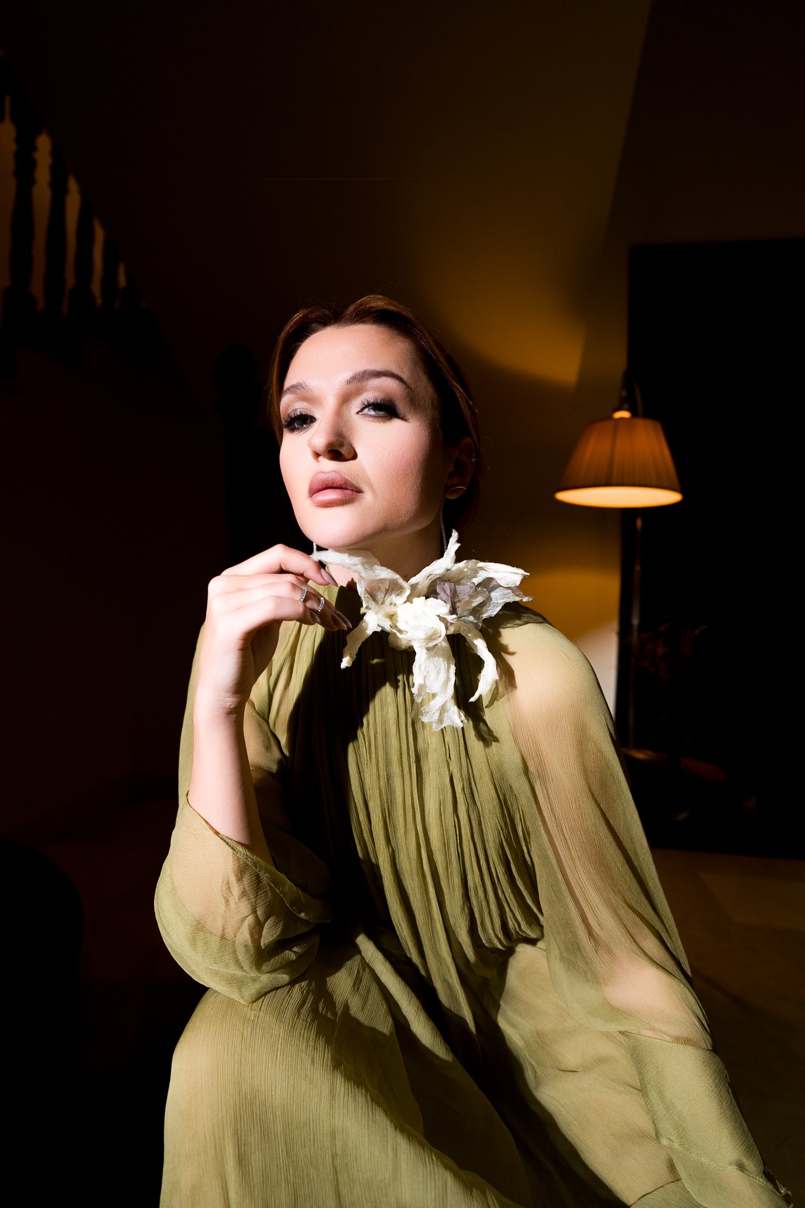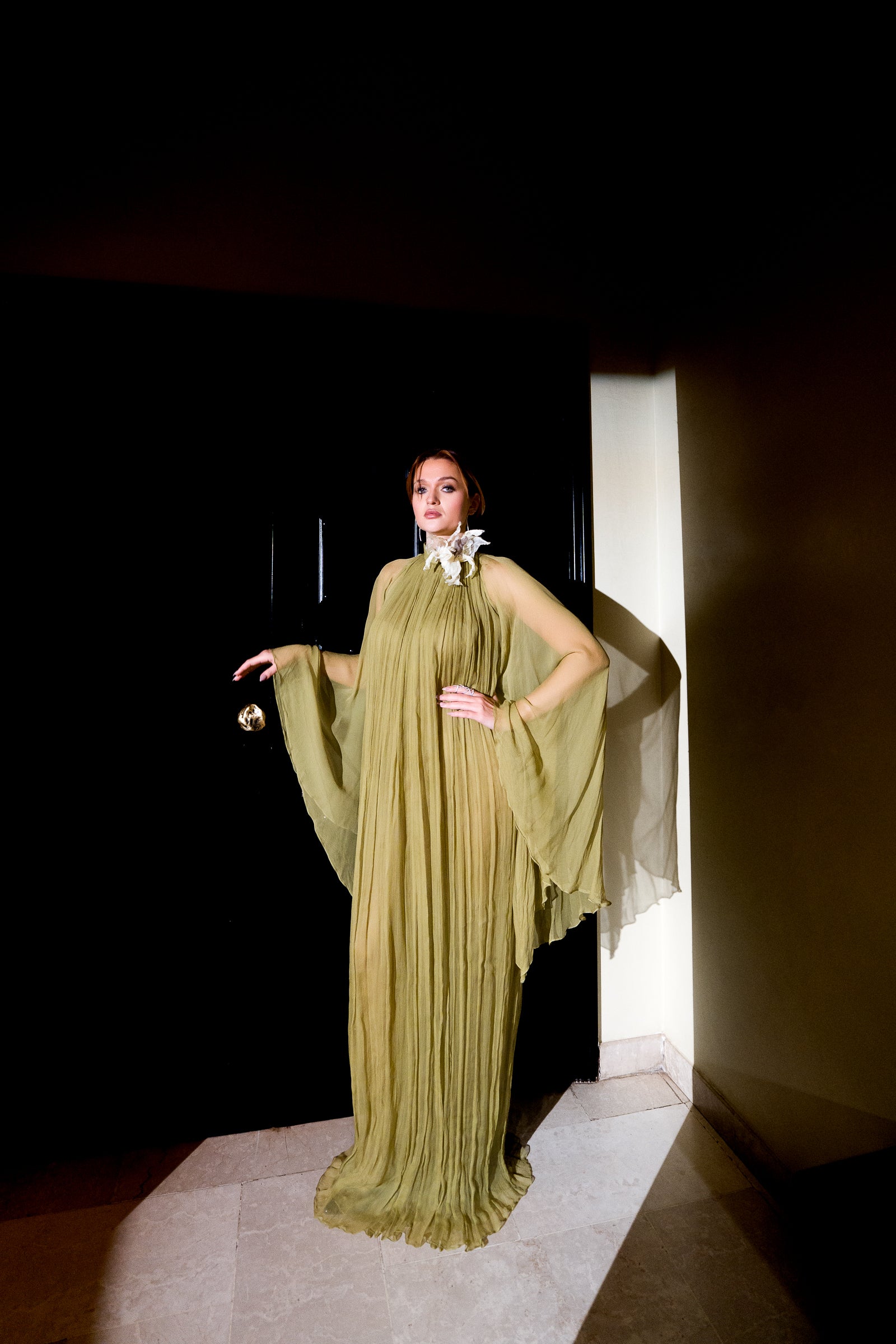 Chiffon silk gown featuring soft vertical pleats and fluid, airy sleeves, finished with a statement handmade floral detail at the neckline.