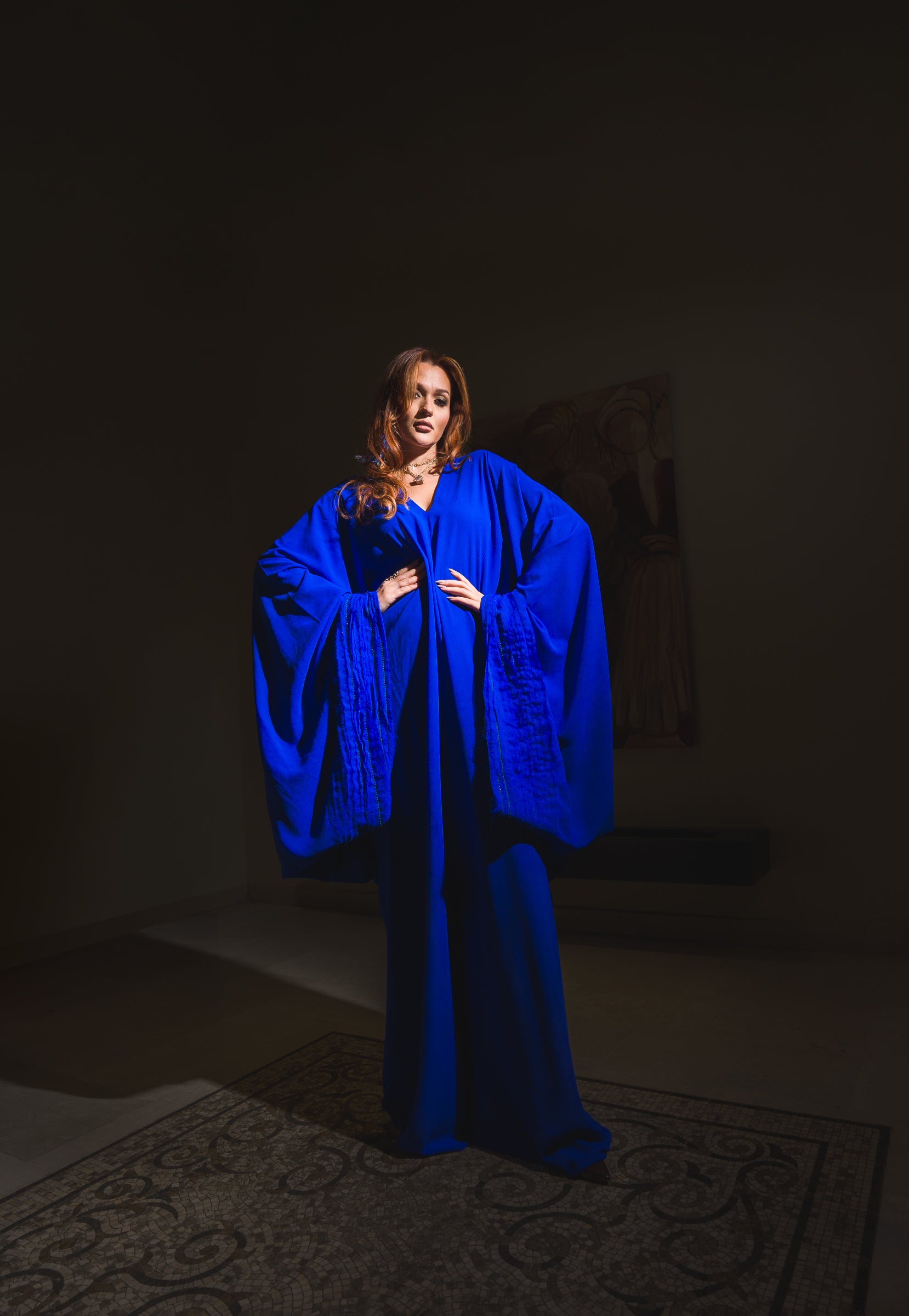 Hand-made embroidery subtly enhances the design, adding texture and refinement without interrupting the fluid drape.