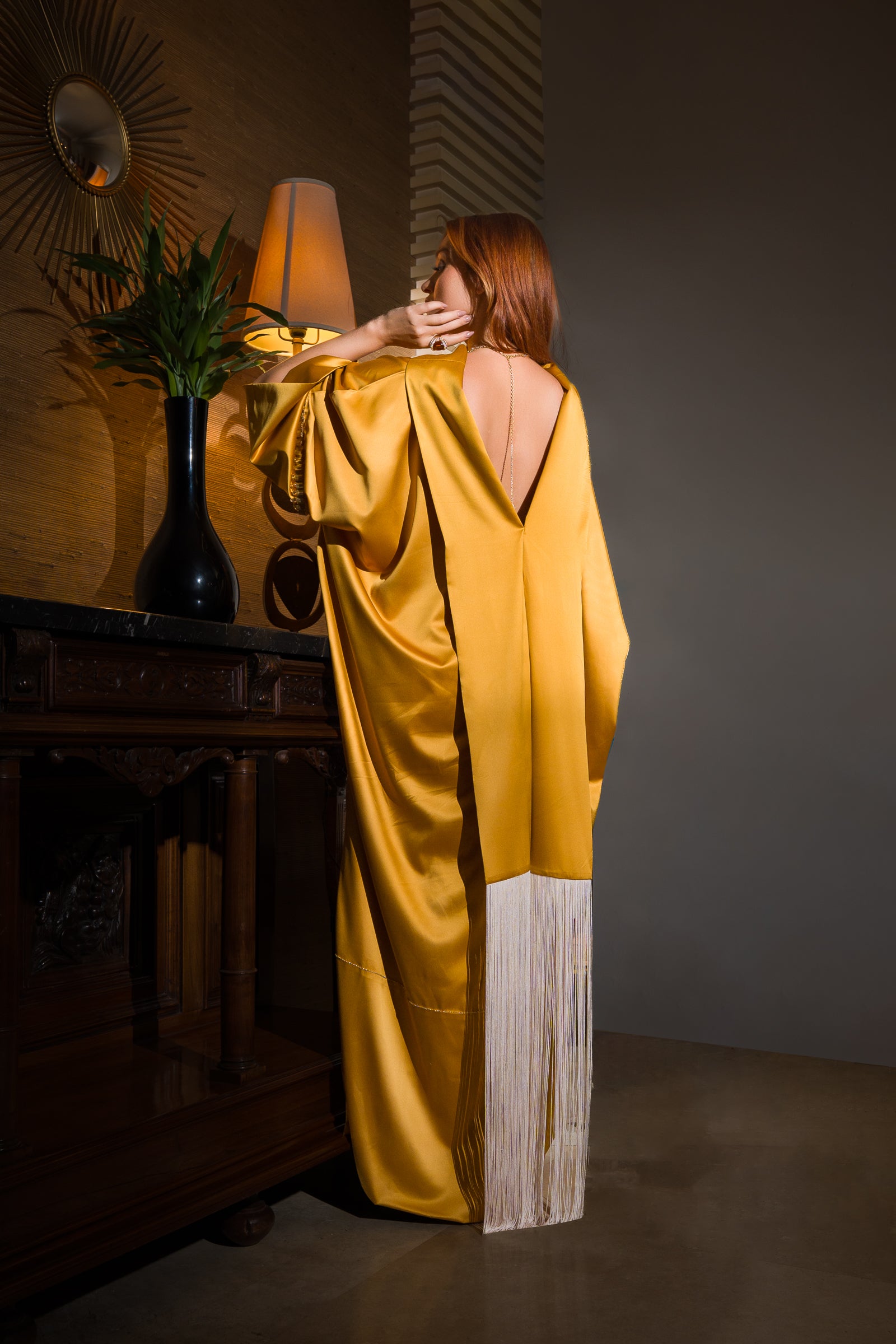 Silk gown crafted with a clean, elongated silhouette that highlights the natural sheen of the fabric.