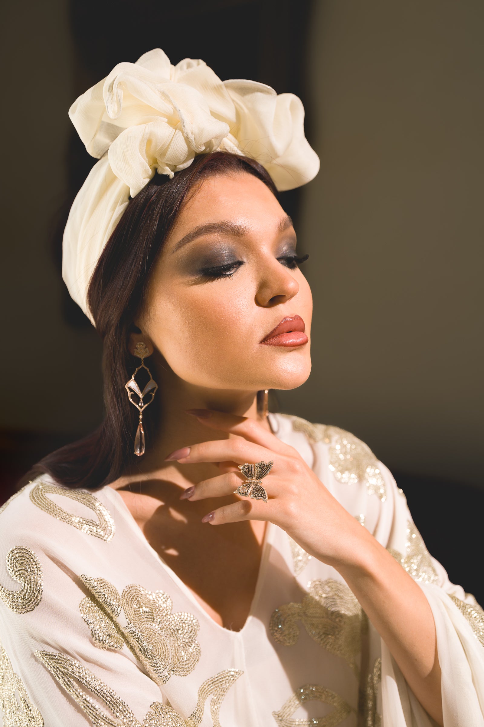 Chiffon dress enriched with printed embroidery, combining soft transparency with graphic elegance.
