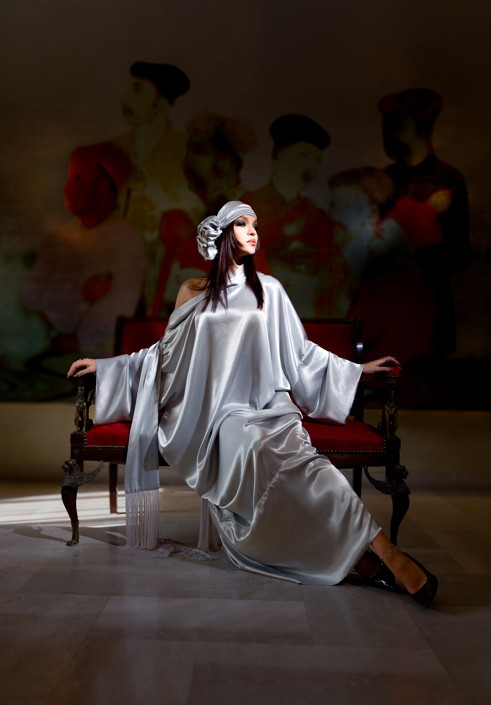 Silk gown defined by a lustrous finish and fluid drape, elevated with a cascading fringe detail that adds depth and movement.