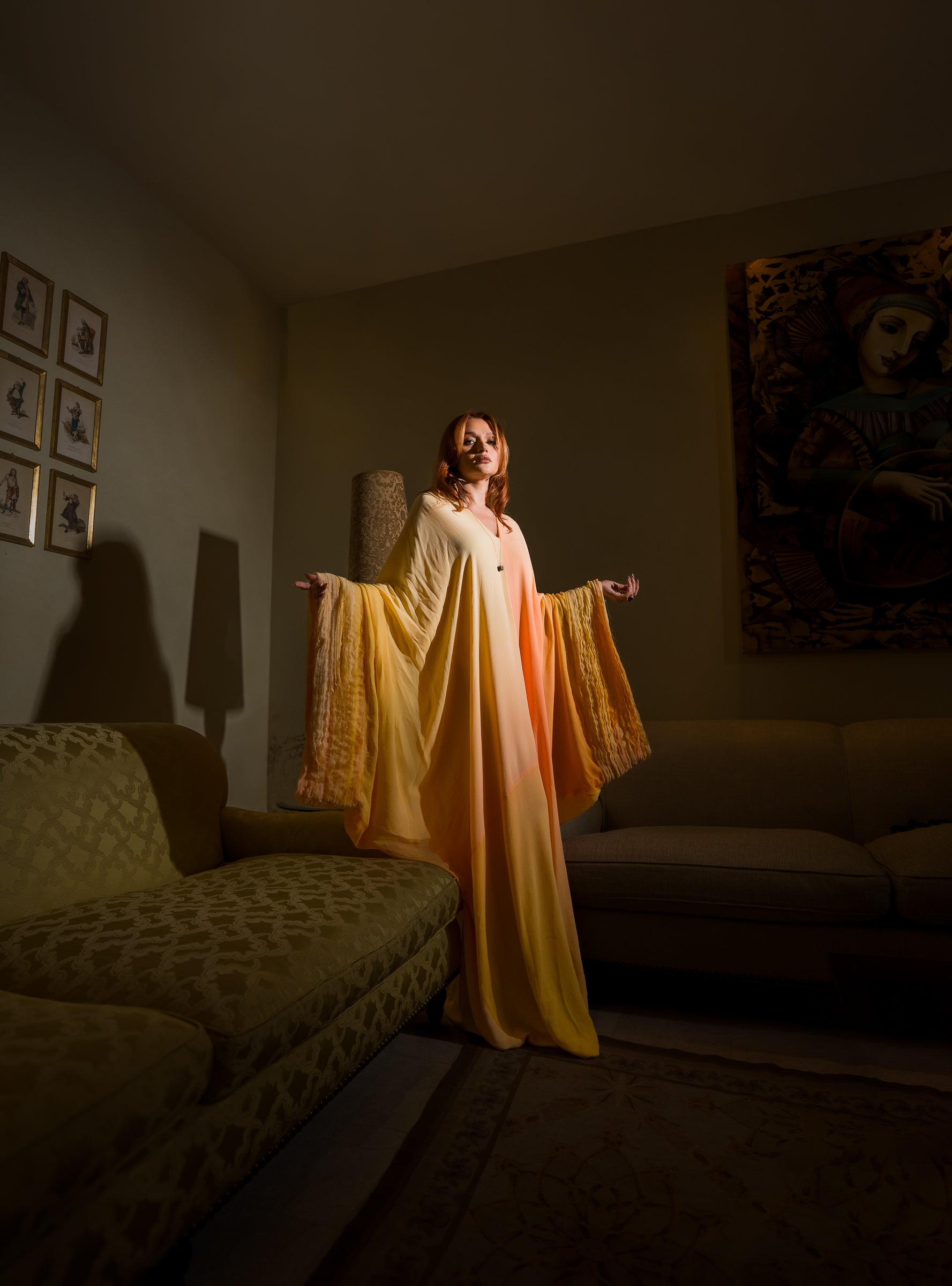 Chiffon georgette gown crafted with a soft gradient flow, enhanced by hand-made embroidery along the sleeves for added texture.