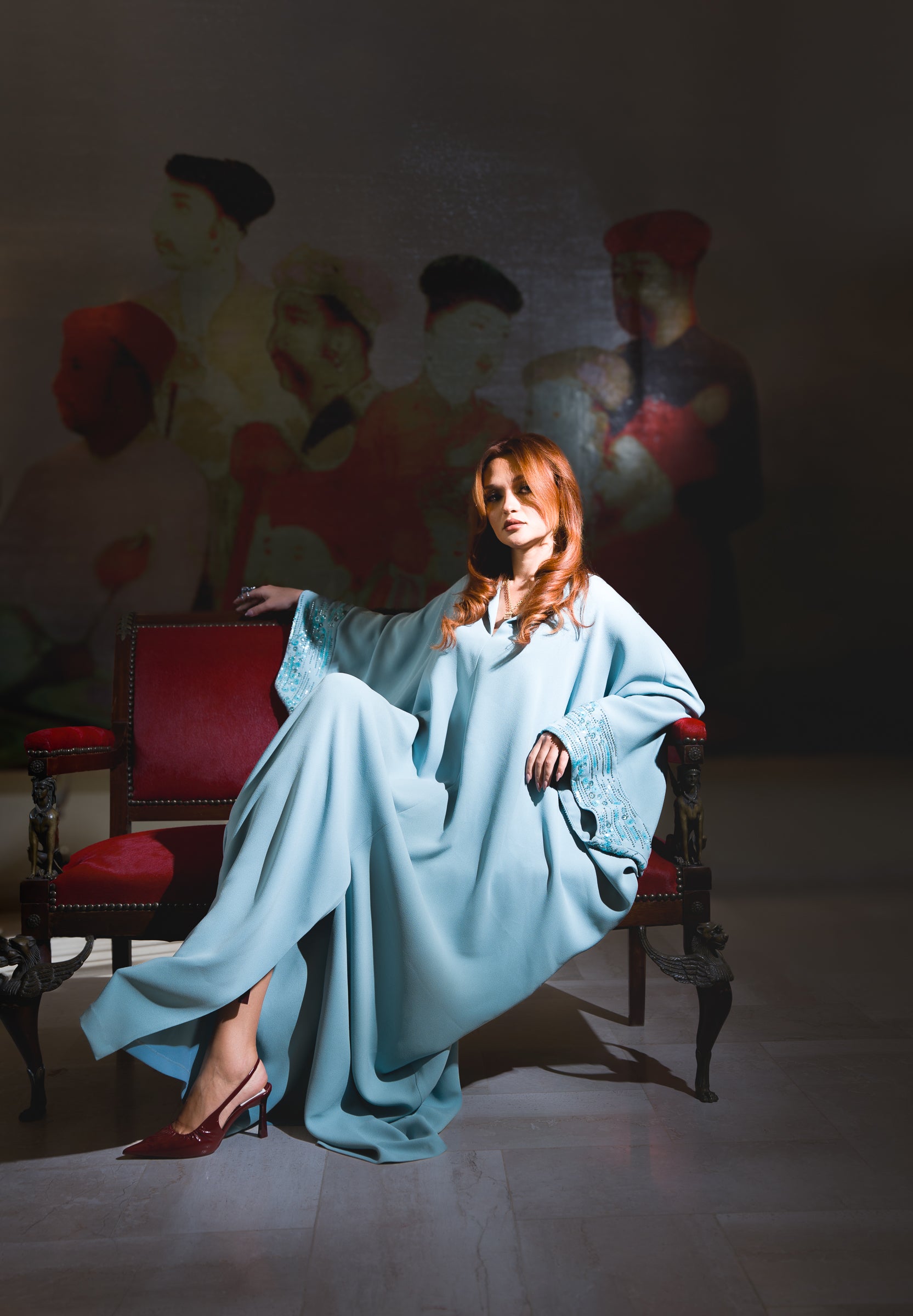 Crepe gown featuring fluid draping and hand-made embroidery accenting the sleeves with subtle brilliance. The relaxed silhouette and refined detailing create a quiet statement of modern elegance.